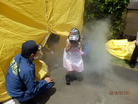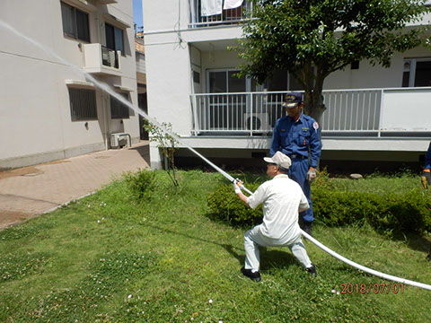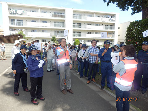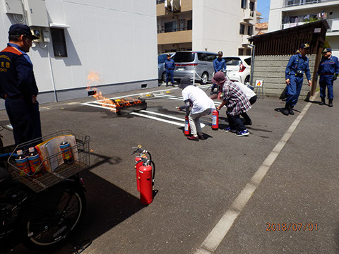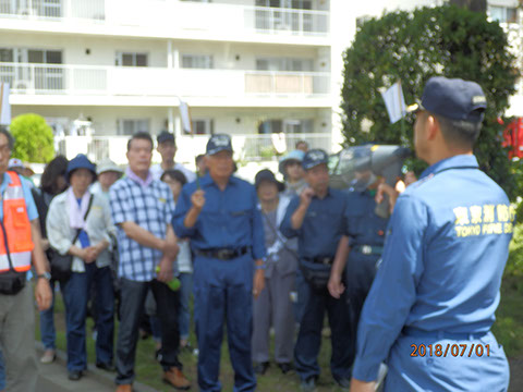 7 - 7<>平成30年度の天沼一丁目町会の防災訓練が7月1日(日)(株)テツゲン社宅構内で開催されました。当日は快晴でしたが真夏日予想のため参加者全員に飲み物が配布されました。茂木町会長の挨拶に続き、白石荻窪消防署天沼出張所長の訓練の流れテツゲン社宅構内に新たに設置された貯水タンクの説明、防災訓練の意味などの説明があり、4班に分かれ、消火器体験、AED体験、スタンドパイプ体験、起震車体験、煙体験をし訓練を行った。参加者は大人95人、子ども14名の合計109名でした。