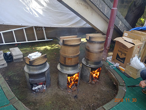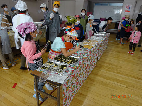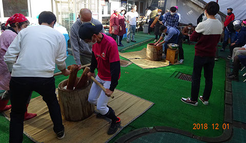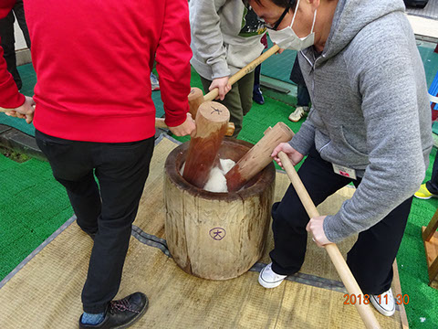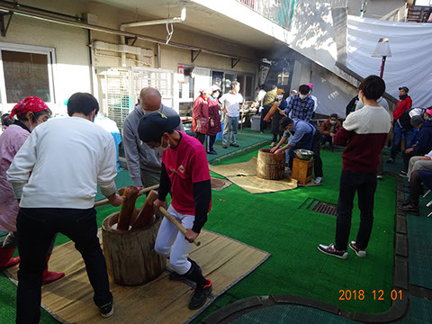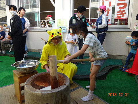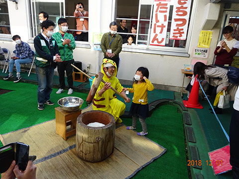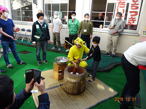 12月1日土曜日、今年も恒例の「あまぬまもちつき大会」が天沼児童館で開催された。当日は好天にめぐまれ、児童のもち券をくばる受付の時間の頃には児童館門前にかなりの行列ができた。おもちづくりは、ボランティア、あまぬまの各団体の皆様の手際よいチームワークで見事にまたたく間に、のりまき、きなこ、あんこの三種類のもちに出来上がった。そして、「もちっこ」のお手伝いで保護者に付き添われた多くの子供たちが順番におもちをいただきました。中庭では「子どももちつき体験」がはじまり、多くの子どもたちが順番待ちの列に並び大いに盛り上がった。