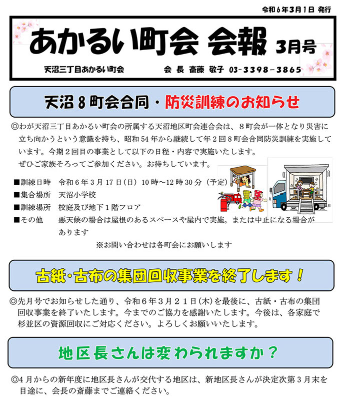 天沼8町会とは / 連合会長より / 事業報告 / パトロール / 回覧版 / 防災マップ