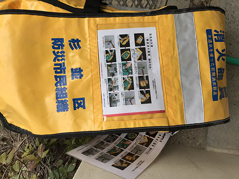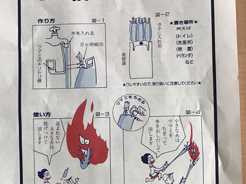 「投てき水パック」は家庭で用意できる簡易型の消化器材です。