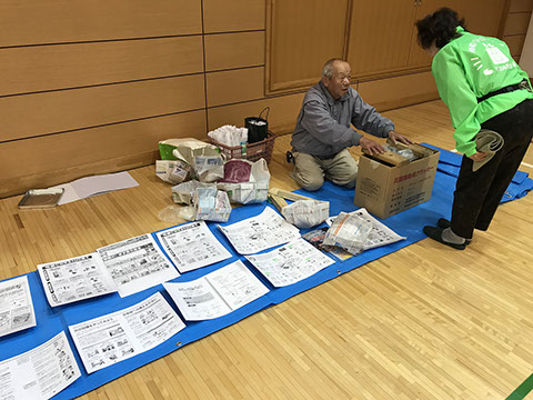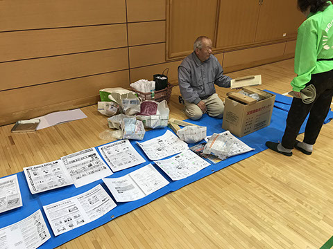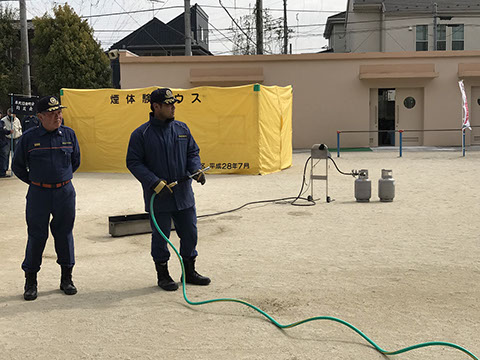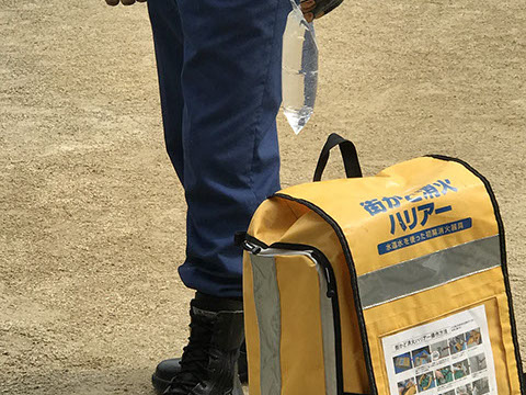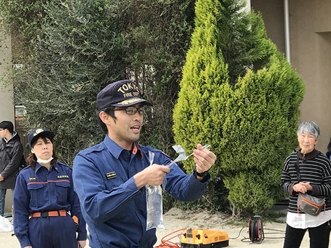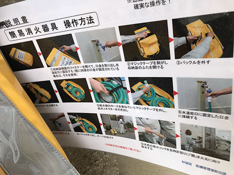 今回は「投てき水パック」や「水道水を使った初期消化器具」の紹介と訓練がありました。
