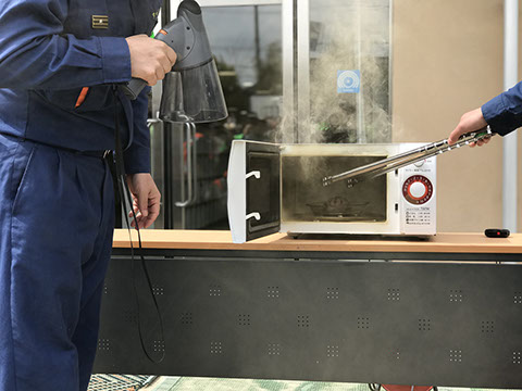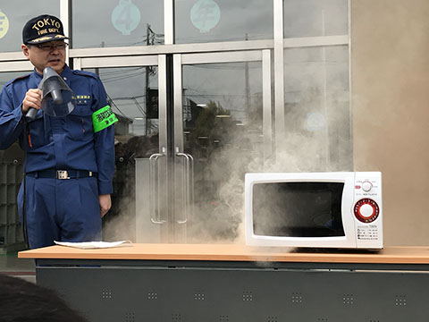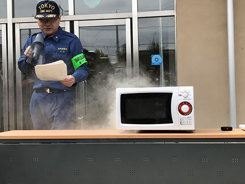 最後には電子レンジ火災実験があり、日頃使っている電子レンジも火災源になることを確認しました。