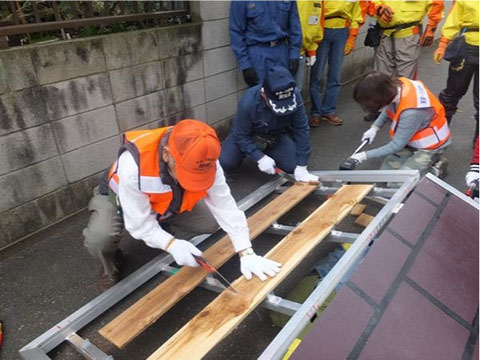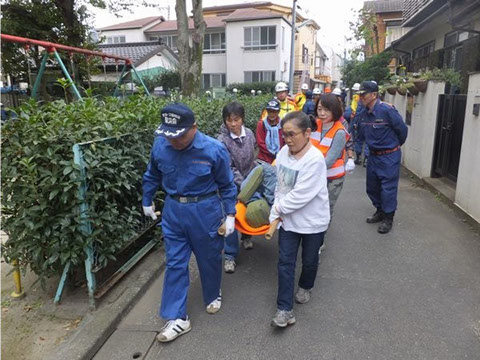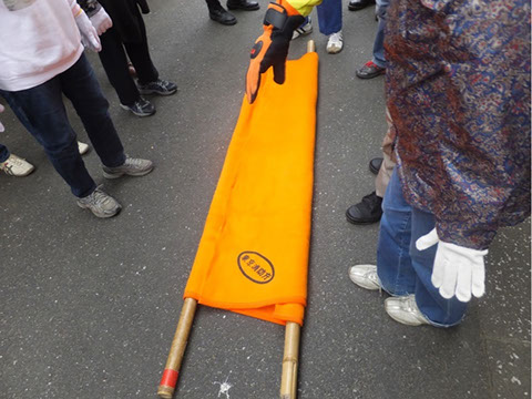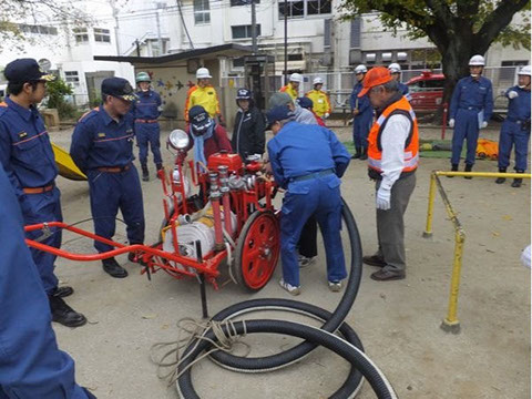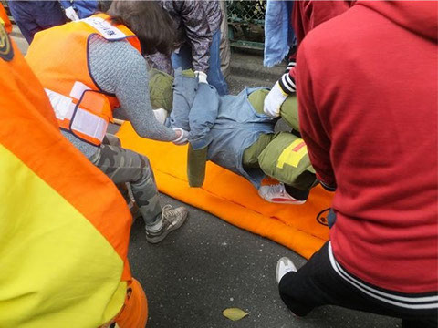 倒壊家屋からの救助、ノコギリやジャッキーを使用、救助された人(人間に見立てた人形)を毛布と竹で作った応急担架に乗せ救護所へ搬送、その後「火災発生」、C級ポンプ及びスタンドパイプを使用しての消火訓練を行いました。