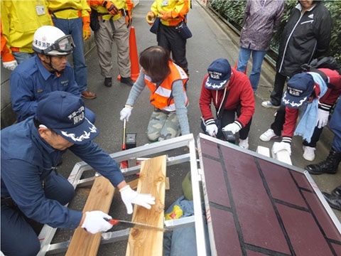 平成27年10月31日(土)午前9時から荻窪消防署天沼出張所による「災害時支援ボランティア」の震災訓練、その後天沼一丁目町会会員のスタンドパイプ訓練を行う予定でしたが、消防からの要請で震災訓練にも参加しました。