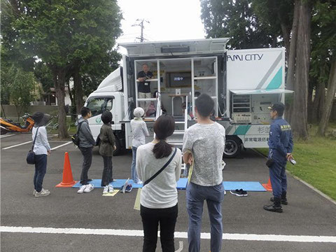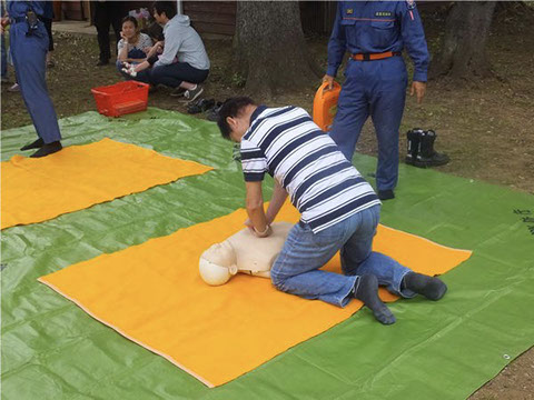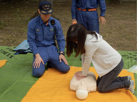 梅雨空でしたが幸い雨も降らず暑くもなく、荻窪消防署天沼出張所・消防団第一分団の指導により皆さん元気に消火器・AED・スタンドパイプ・起震車・簡易水道消火器具(新消火器具)の体験をしました。