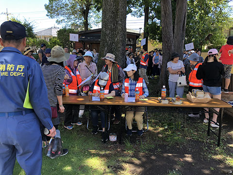 「震災救援所運営連絡会」ののぼりを立て、児童に「防災クイズ」を解いてもらい、おみやげに景品としておもちゃをひとつ渡すというものですが、年々人気が高まり大層な賑わいとなり、面食らうほどになりました。