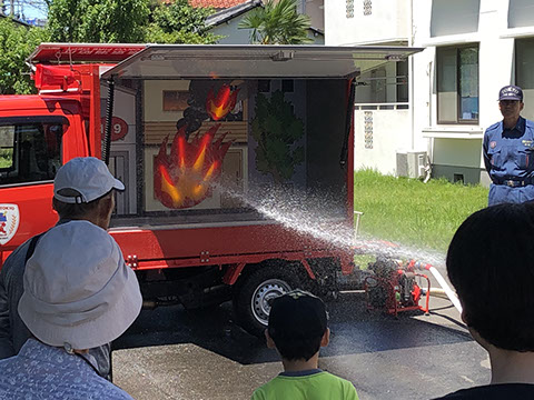 スタンドパイプの放水訓練は軽トラックの的をめがけたもので、初めてのやり方でした。