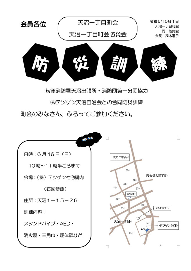 例年6月に行っています「天沼一丁目町会防災訓練」は、会場としてお借りしている(株)テツゲンさんからのコロナ禍懸念を受けまして、中止といたします。ご理解のほどお願いいたします。