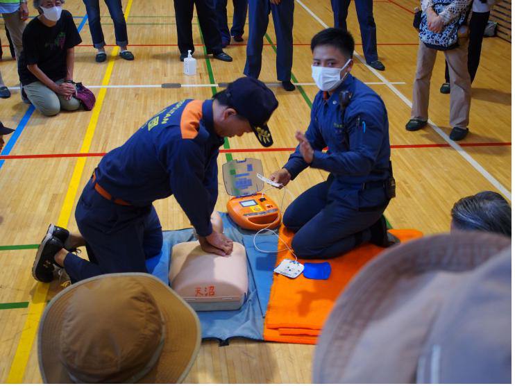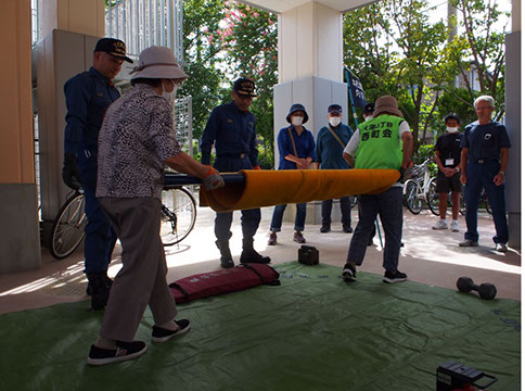 令和5年9月24日(日)午前10時から、天沼小学校において天沼地区8町会合同防災訓練が開催されました。訓練内容は起震車による地震体験、心肺蘇生法、応急担架作成、油圧救助器具の操作等盛りだくさんとなりました。