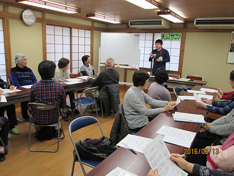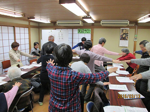〇4月12日は「やさしい太極拳と練功十八法」を伊藤節子さんに、太極拳の実演と練功十八法を教えていただき、参加者で体を動かし体験しました。実演は、剣や扇を使いしなやかで力強い伊藤さんの動きに見とれてしまいました。練功十八法は、呼吸を意識しながら、体の端まで伸ばし、普段使わない筋肉を使って、座りながらでもよい運動になりました。
