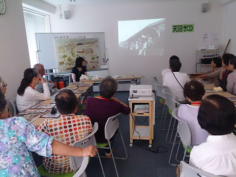 今や杉並区には、面積の約1%しか農地はないそうです。以前もそれほど農地は多くはなかったようですが、それでも、大人数でくるり棒を使い、畑を耕す映像などがありました。当時は、肥料として人糞をつかっていたというお話になり、色々な裏話があり面白かったです。実際に博物館から、肥桶と天秤棒の実物をお持ちいただき、懐かしいという声もあがりました。郷土博物館の分館には、より地域に密着した展示があります。ぜひ、みなさん折に触れて訪ねてみてください。