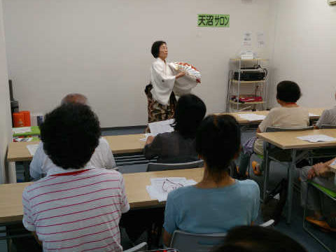 ○4月26日は日本赤十字社の笠井樹さんをお呼びし、震災時にも行えるハンドマッサージを教えていただきました。まずは、じゃんけん遊びなどをして場が和み、避難所の窮屈な中でも取り入れると笑顔になれるということでした。ハンドマッサージは、市販のボディケアクリームを使い、2人1組になって指先からひじまでマッサージをし合いました。あちこちから、気持ちいいの声があがり、いざというときに覚えておくとよいコミュニケーションのツールになりますね。