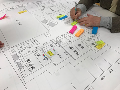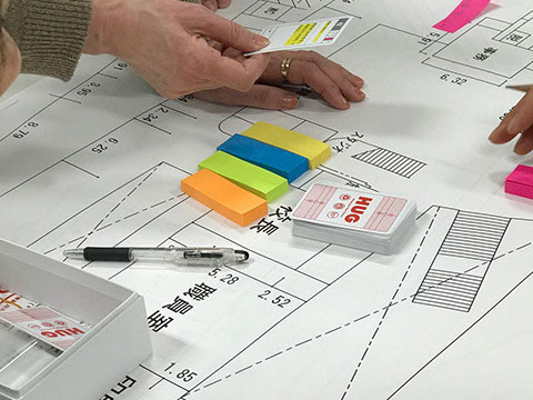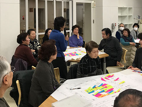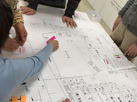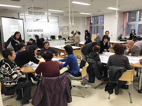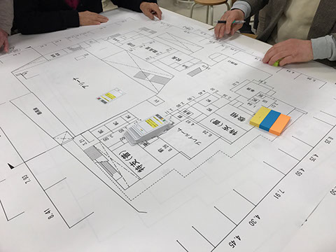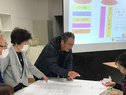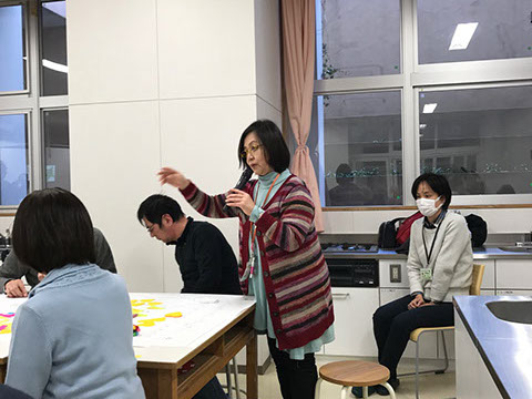 6テーブル各6〜7名が参加してカードに書かれた情報を基に救援所としての対応を考えるゲームです。同じ情報でも各テーブルで意見が分かれます。最後に各テーブルの代表から話し合われた内容や対応の発表がありました。正解の無いゲームです。多様な意見を聞くことで各部のマニュアル修正の参考にもなりました。