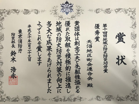東京消防庁による第14回地域の防火防災功労賞を天沼連合会が受賞しました。
