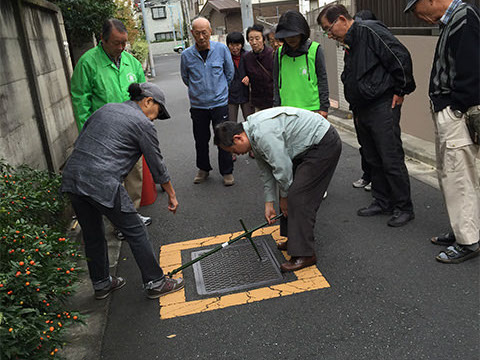 天沼尚和会では現在(平成27年11月)5台のスタンドパイプを町内会に設置しています。消火栓のある近所の方にお願いして設置してますが、今回2丁目に設置した1カ所で訓練をしました。近所の方に集まっもらい動作確認をして実際に稼働できるか試しました。