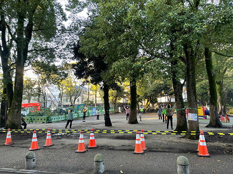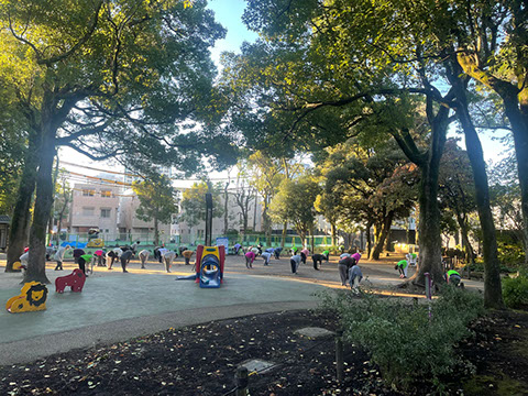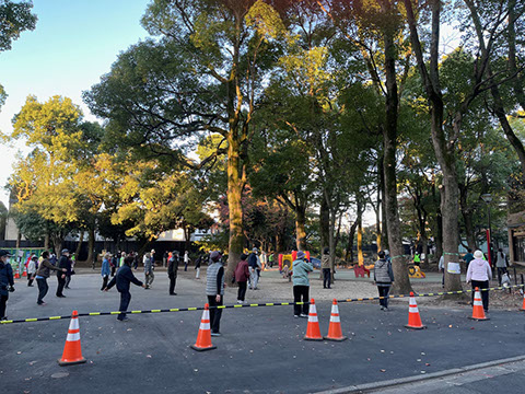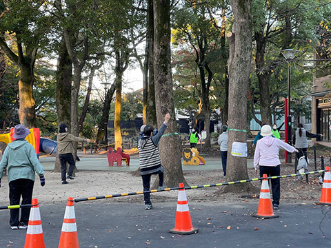 11月に入り弁天池公園が下水道工事のため体操スペースが半分程度になり狭くなりました。ここに遊びに来る人には少し不便です。今日も元気に体操をしています。