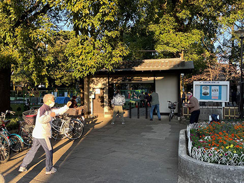 朝、弁天池のラジオ体操に時々イヌがきます。体操に来る方のペットになっています。高齢になると飼いづらいのでこの瞬間が安らぎになります。友だちとオシャベリ、体操、イヌに触れる。この時間の大切な要素です。