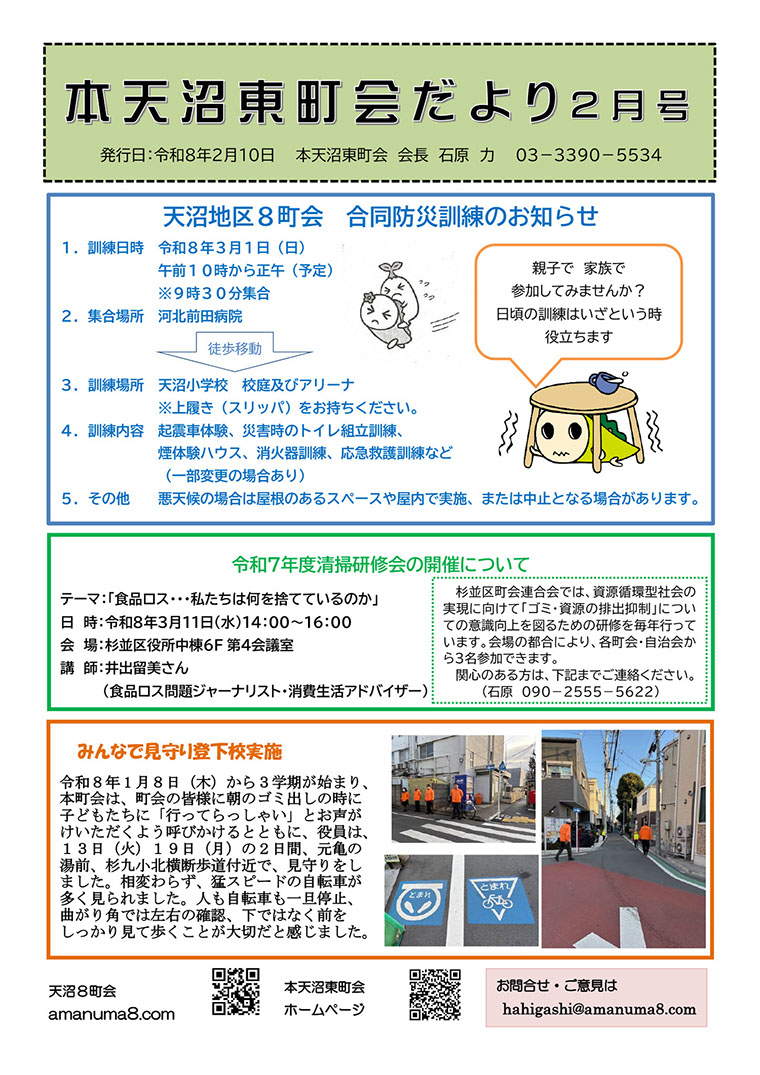 天沼8町会とは / 連合会長より / 事業報告 / パトロール / 回覧版 / 防災マップ