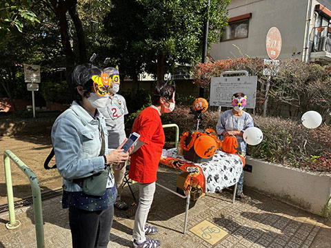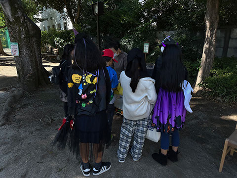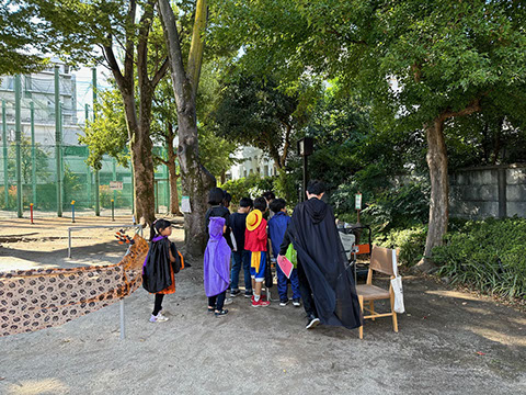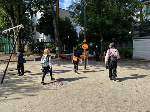 小学生が1班から22班に分かれて「トリック オア トリート」と言ってお菓子をもらって歩きます。場所は小学校を中心に天沼にある10の公園がお菓子をもらう場所です。Thank youで次の公園に向かいます。天沼尚和会は二つの公園に参加しました。